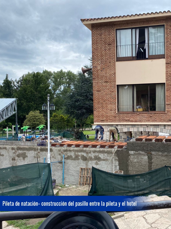 El futuro pasillo de comunicación entre el hotel y la pileta ya tenía levantadas la mayor parte de sus paredes laterales, también materializadas con bloques, a las cuales se las estaba revocando y se había ejecutado el contrapiso.