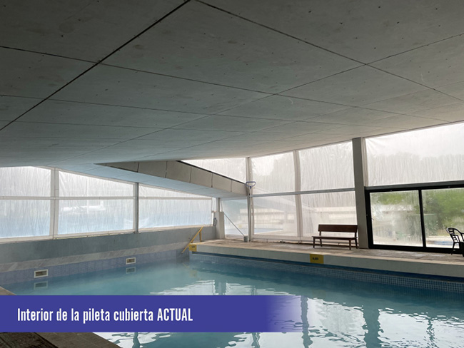 Para el nuevo cerramiento de la pileta de natación se ha levantado una estructura metálica conformada por vigas reticuladas de perfiles de acero galvanizado con columnas metálicas de hierro. En la cubierta se dispusieron chapas cincadas y se estaba armando el cielorraso con placas cementicias.