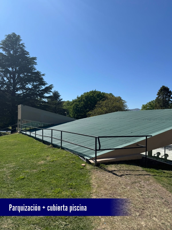 En el sector piscina cubierta se ejecutó una estructura metálica y sobre ella se dispusieron chapas acanaladas dándoles pendiente. En forma similar pero con una pendiente inversa se hizo el pasillo de comunicación entre la pileta y los vestuarios. En tanto que el pasillo de comunicación entre la pileta y el hotel se materializo con bloques cementicios y un techo de viguetas y ladrillos cerámicos. El espacio posterior del natatorio y su lateral hasta donde está el hotel fue rellenado con tierra y está siendo cubierto por césped, lo cual hace que el cerramiento de la pileta quede integrado visualmente al parque y no conforme un edificio aislado.